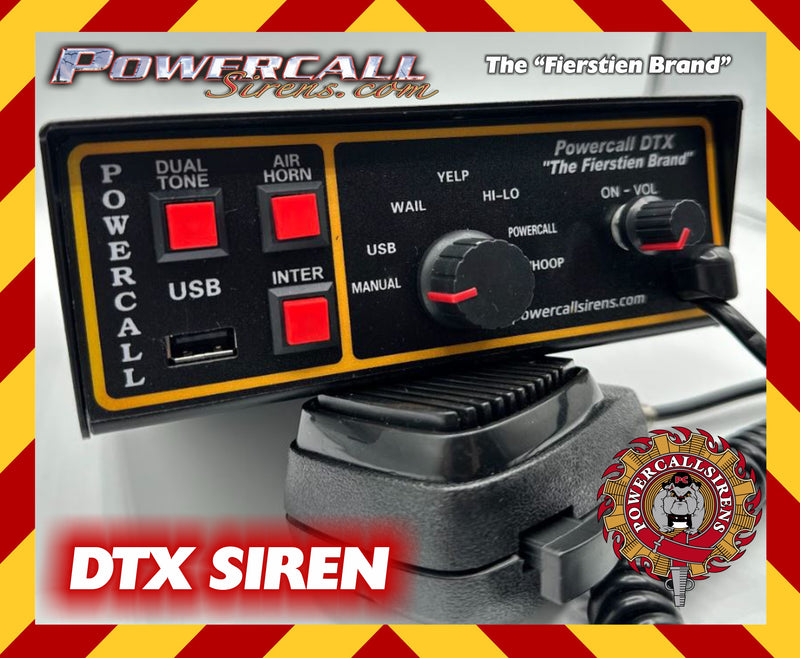 The Powercall DTX is David Fierstien's latest 2023 version of the DX series Powercall Siren with a DUAL TONE capability. This new siren has a new advanced microprocessor-based technology and features the highest quality circuitry and design, keeping with the industry standard. This siren, just like the UDX7 ,has all newly updated tones, including a "PA-300" sounding Wail and Yelp, which will trigger most traffic preemption systems and gates. It also has a more defined Powercall (Warble) tone, that was taken directly from one of our GE units, the Whoop tone, a Hi-Low, Phaser, Airhorn and the always popular Intersection mode. This siren has exactly the same capabilities as the Powercall UDX7, but is missing the PHASER option, to allow for DUAL TONES.